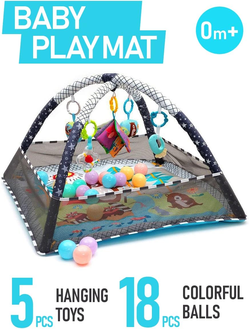 - Customizable Toy Selection: This baby play mat comes with 5 hanging toys, including a cotton book, rattles, and cotton teething toys, to stimulate your baby's senses and cognitive development. The toys are detachable and can be freely arranged on the foam bars according to your baby's preferences. Additionally, the play mat includes 18 colorful ocean balls for added fun and engagement.